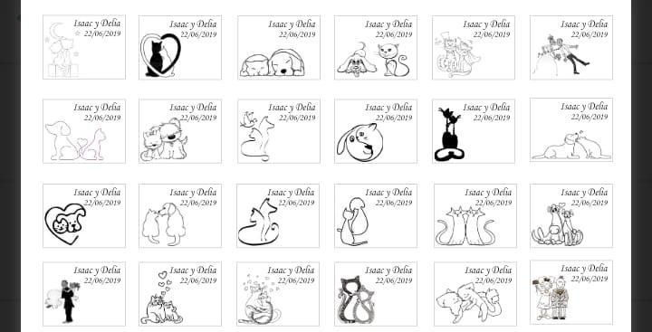 Todos los productos llevan una reseña de que el coste de los productos ha ido íntegramente destinado a nuestra protectora, no obstante, dependiendo del tiempo con que se haga el encargo, podemos incluir (con un pequeño sobrecoste) la presentación individual con una tarjeta a elegir entre varios modelos con el nombre de la pareja y la fecha del enlace/bautizo/comunión... todo ello presentado dentro de una cesta.